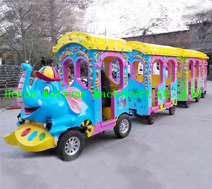 Elephants trackless train are very popular amusement equipment in park and playground. As a tourist train,this amusement park train can run far away used electricity. This electric train using the modeling of the elephant to do locomotive, with charming LED lights and sweetly music ,so it is deeply loved by kids.