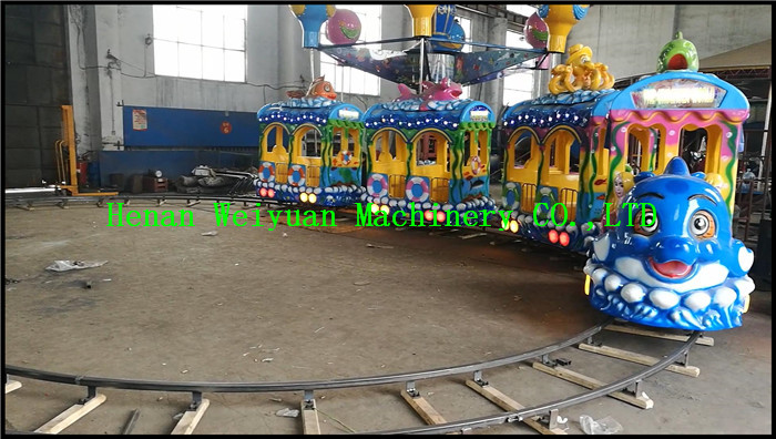 Ectric Ocean Train is a new style of track train that uses the kids love marine style cabins. The blue dolphin, the dream mermaid, leads the baby into the dream world of the ocean, and the happy childhood extends infinitely on the ocean train. The shape of this small train is designed in an antique style, and the shape is very beautiful and very ornamental. The ocean track train is of high quality, non-polluting and non-emission. It is very suitable for use in tourist areas, pedestrian streets, parks, playgrounds, and residential areas.